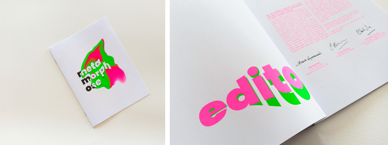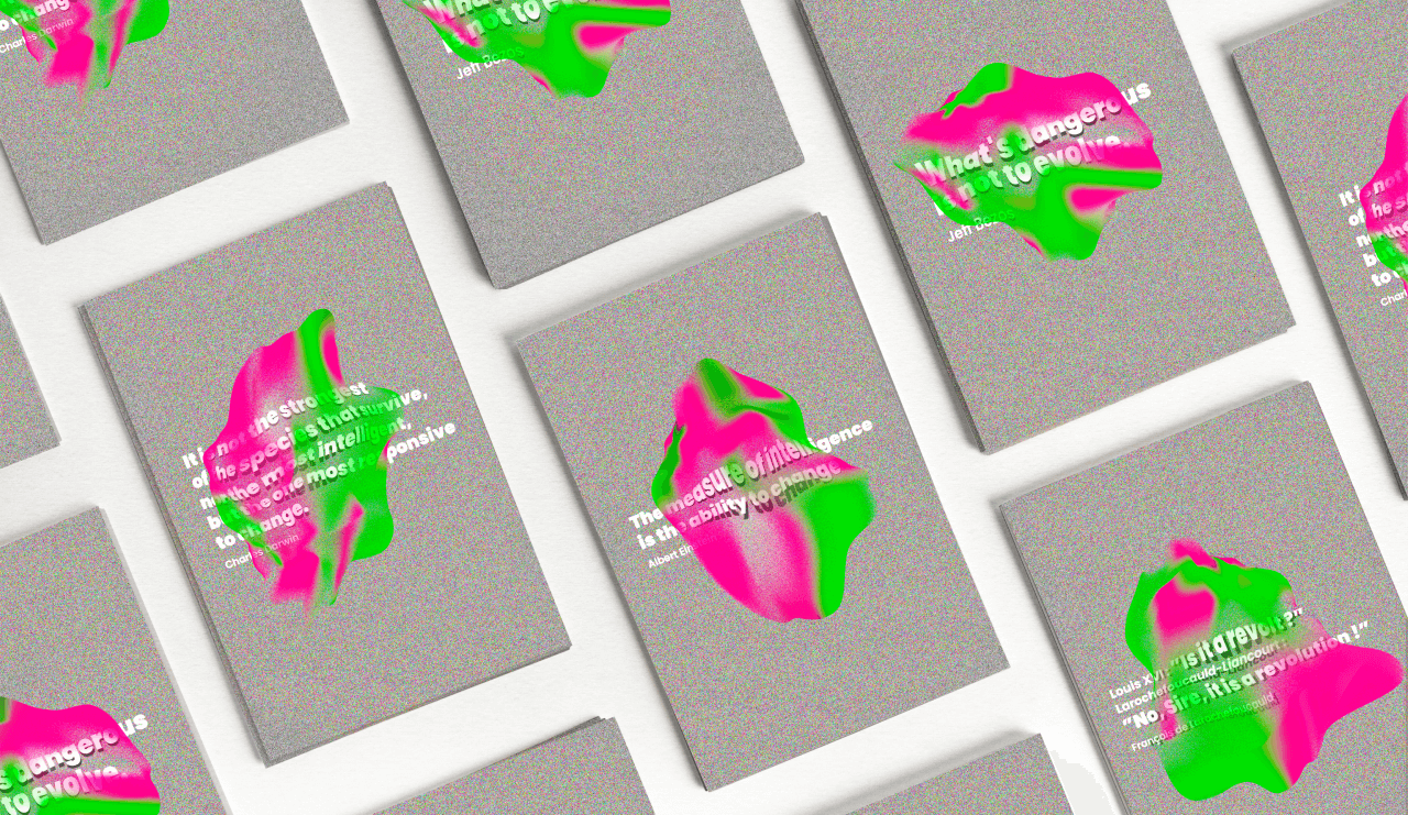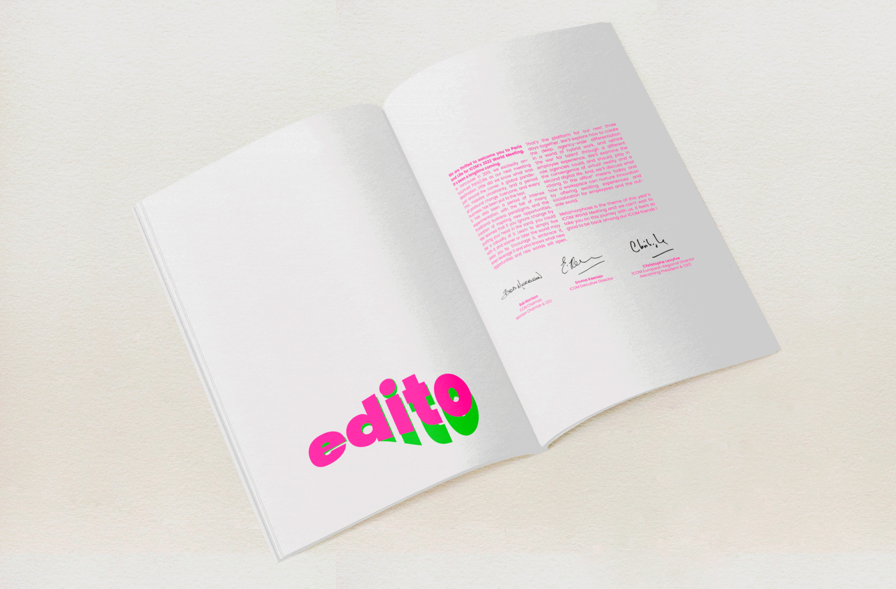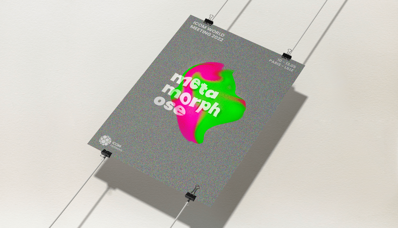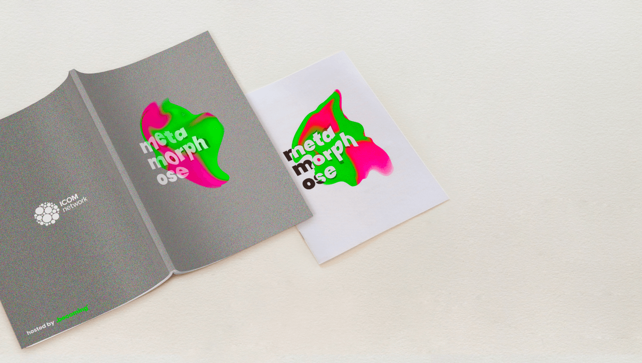 les supports de communication ICOM meeting font vibrer des couleurs puissantes qui émergent du brouillard. Une typographie en mouvement accompagne l’ode à la métamorphose.