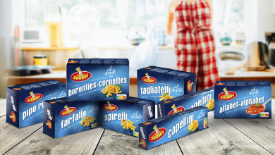 An updated box with a fresh font, and a modernized and redesigned brand logo. The distinguished brand colors remain the same, but a new chef appears, wearing the same legendary ‘pasta hat’.